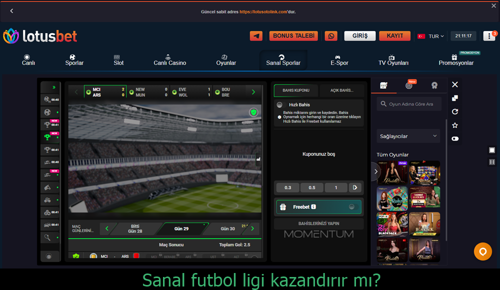 Lotusbet, bahis sitesinde oynama fırsatına sahip olabileceğiniz çok farklı bahis seçenekleri sizleri karşılamaktadır. Sanal bahis oyunları arasında yer alan ve lotusbet, bahis sitesinde erişim sağlama fırsatına sahip olacağınız, sanal futbol liginde ‘ İngiletere’ ligi sanal bahisi oynayarak sağlam para kazançları elde etme fırsatına sahip olabilirsiniz. Son derece kaliteli bahis oyunlarını sizlerin hizmetine sunmakta olan bahis sitesinde, sanal futbol ligi kazandırır mı ? sorusunu çok fazla duymaktayız. Sanal bahis oyunlarında aslında kazanç elde etmek çok basit bir şekilde gerçekleşmektedir. Spor bahislerin de olduğu gibi bahis seçeneklerini oynayarak sizlerde kısa süre içinde sanal bahis oyunların da kazanç elde etme şansına sahip olabilirsiniz.