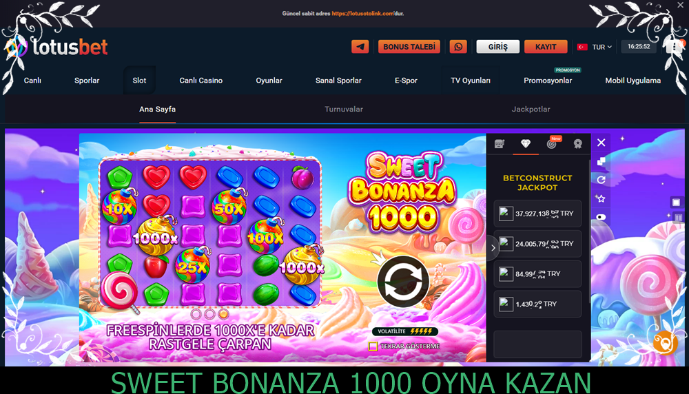 LOTUSBET, bahis sitesinde, SWEET BONANZA bahis oyunu oyna ve sende kazan! Hızlı ve güvenilir bahis oyunlarını sizlerin hizmetine sunmakta olan bahis sitesi, LOTUSBET ayrıcalıkları ile para kazancı sağlama şansına sizlerde şimdi kolay bir şekilde erişe bilmektesiniz. Kaliteli bahis oyunların dan birisi olarak ön plana çıkan SWEET BONANZA 1000, bahis oyununda sizlerde çok yüksek miktarlar da para kazancı elde etme şansını kaçırmayın derim. Bahis sitelerinde, çok farklı bahis seçenekleri sizlerin karşısına çıkmaktadır, bu seçenekler den bazıları gerçekten de çok iyi bahis oyunları olarak dikkat çekmektedir. SLOT salonu bahis oyunlarında para kazancı elde etme şansınız çok daha iyi bir noktaya gitmeyi sürdürmekte ve siz değerli bahis oyuncularına kaliteli zaman geçirme fırsatı sunmaktadır.